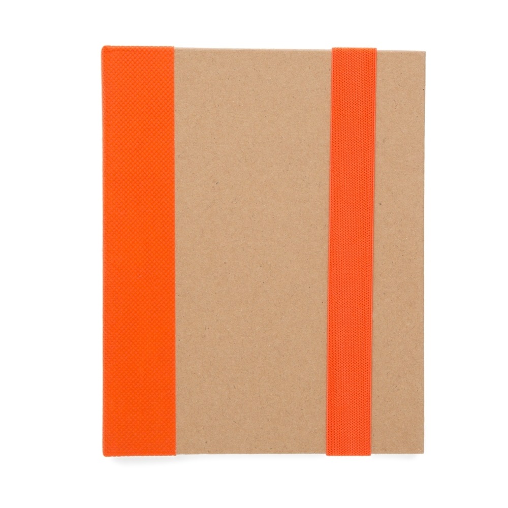 Bloco de anotações ecológico com caneta e autoadesivos, material kraft. Possui uma faixa colorida em tnt e fita elástica, parte interna com suporte para caneta de papelão com clip plástico; bloco amarelo médio com aproximadamente 20 folhas; bloco amarelo pequeno com aproximadamente 20 folhas; cinco blocos autoadesivos coloridos com aproximadamente 20 folhas cada e bloco de folhas pardas com aproximadamente 70 folhas.