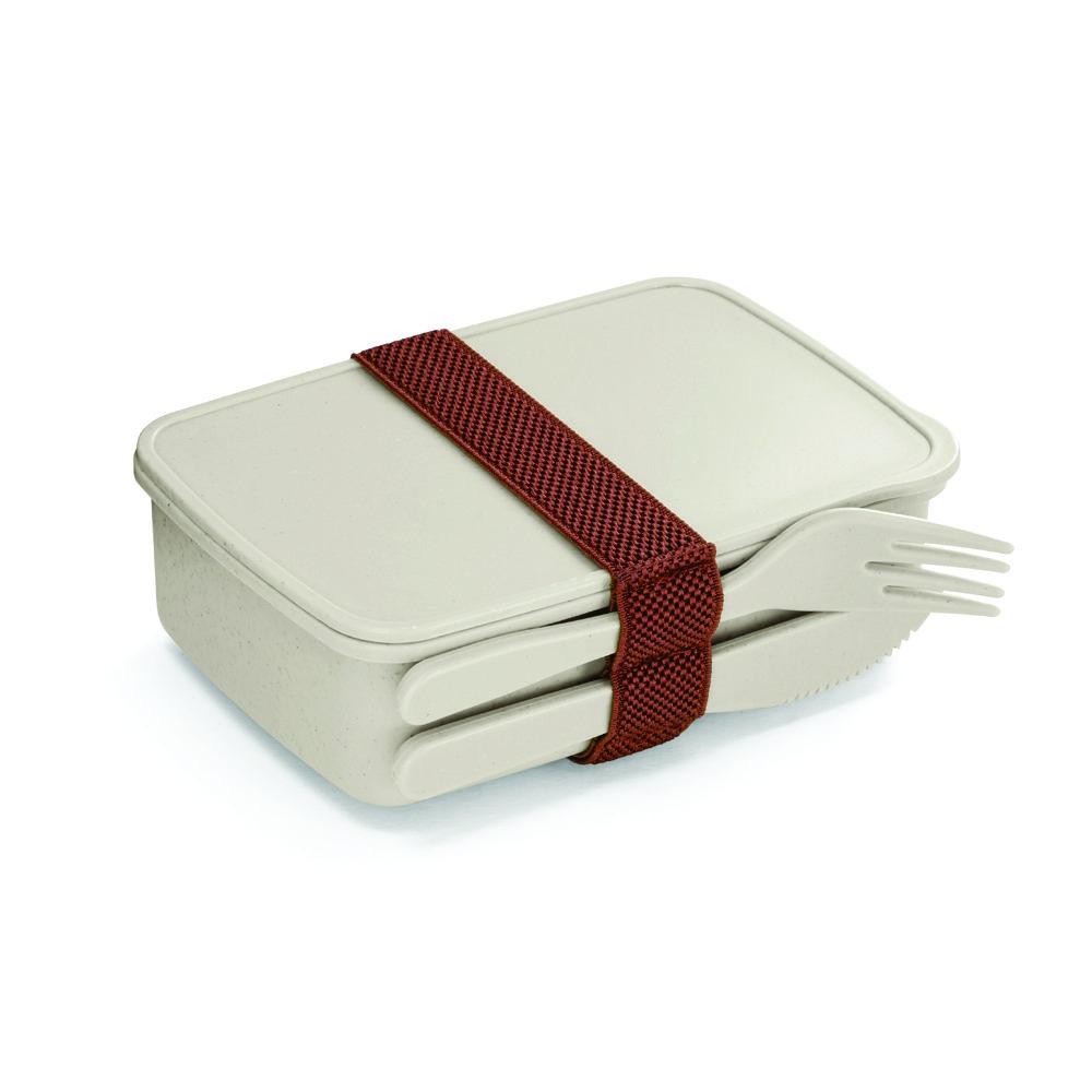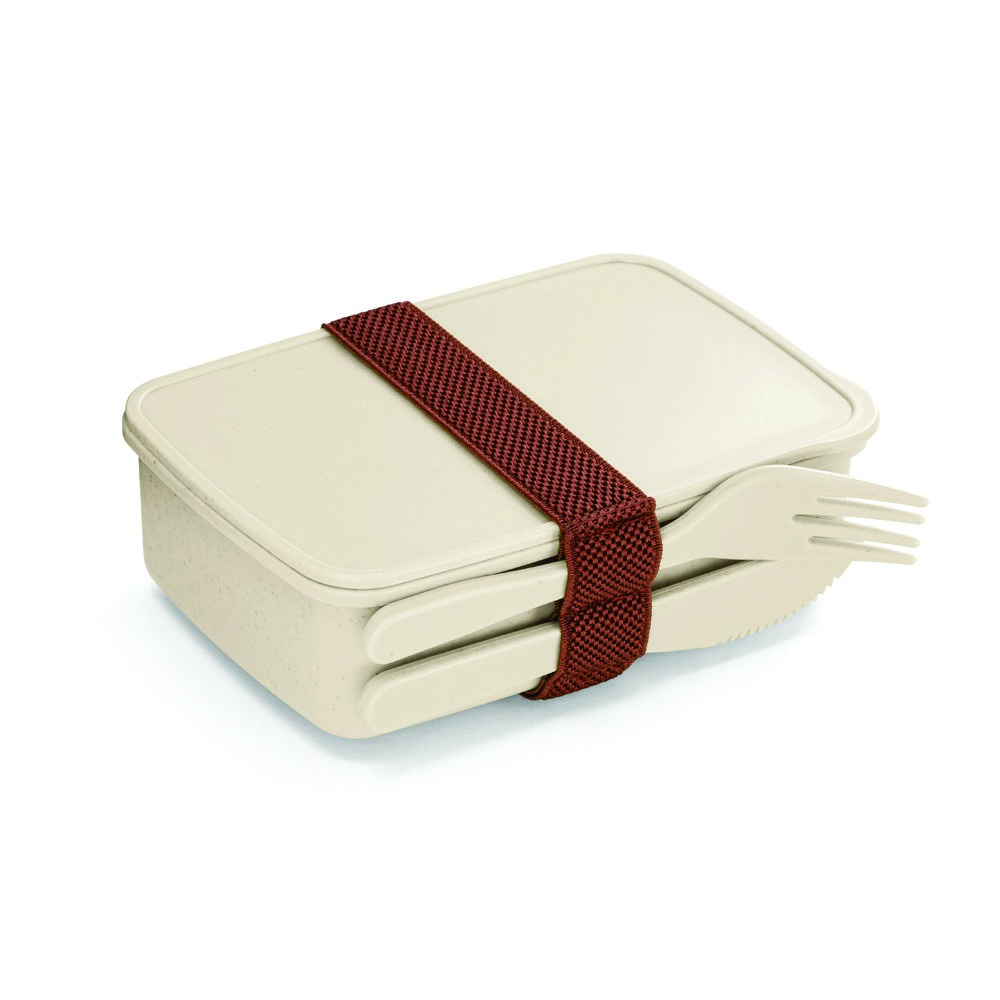 Marmita. Fibra de bambu e PP. Com 2 talheres: garfo e faca. Fecha com banda elástica. Apto para microondas (retirar a tampa). Food grade.