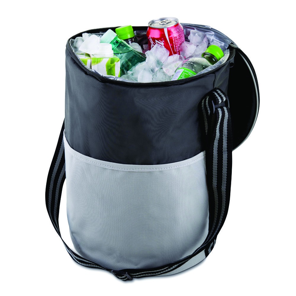 Bolsa térmica, capacidade 25 litros, tecido nylon e poliéster, bolso frontal, alça de ombro regulável, parte interna soldada = retém liquido, gravação bolso frontal ou tampa.