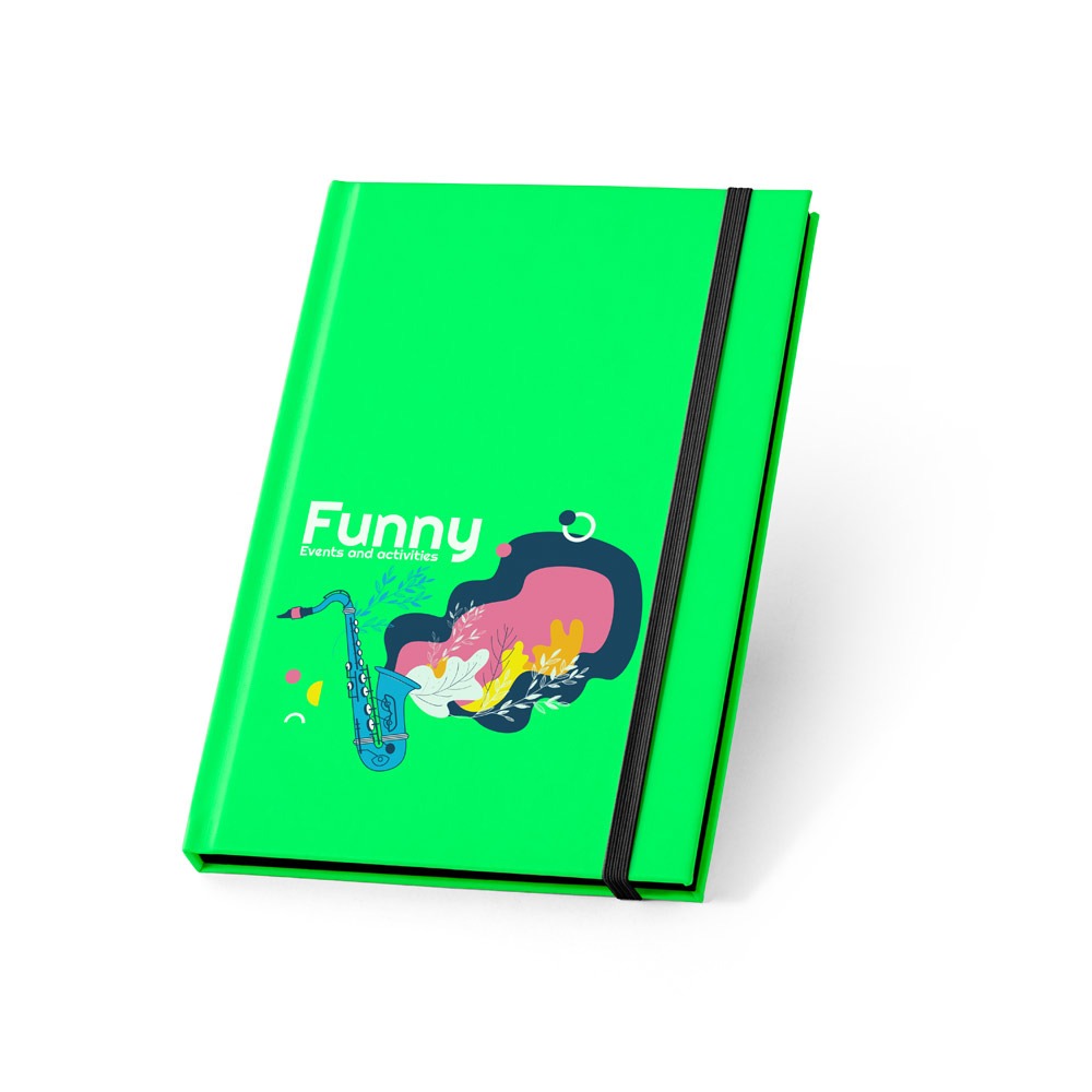 Caderno A5 com capa dura em PU fluorescente. Contém 96 folhas pautadas brancas com a borda em preto, fita separadora e elástico.