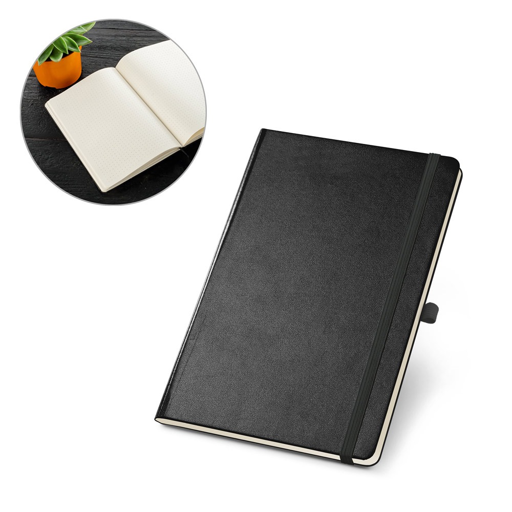 Caderno A5 com capa dura em c. sintético e 80 folhas pontilhadas em cor marfim. Contém elástico, fita separadora, bolso interior e suporte para esferográfica (não inclusa).