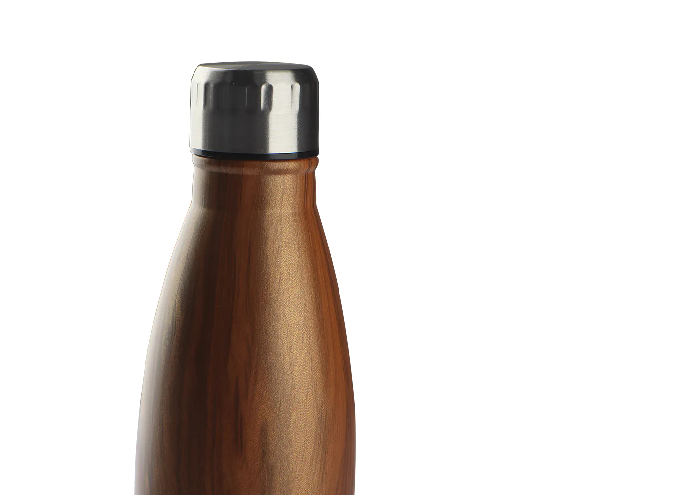 Garrafa em aço inox com capacidade de até 750 ml com textura imitação madeira. Tampa rosqueável e anel de silicone para vedação. Design com uns frisos na tampa.