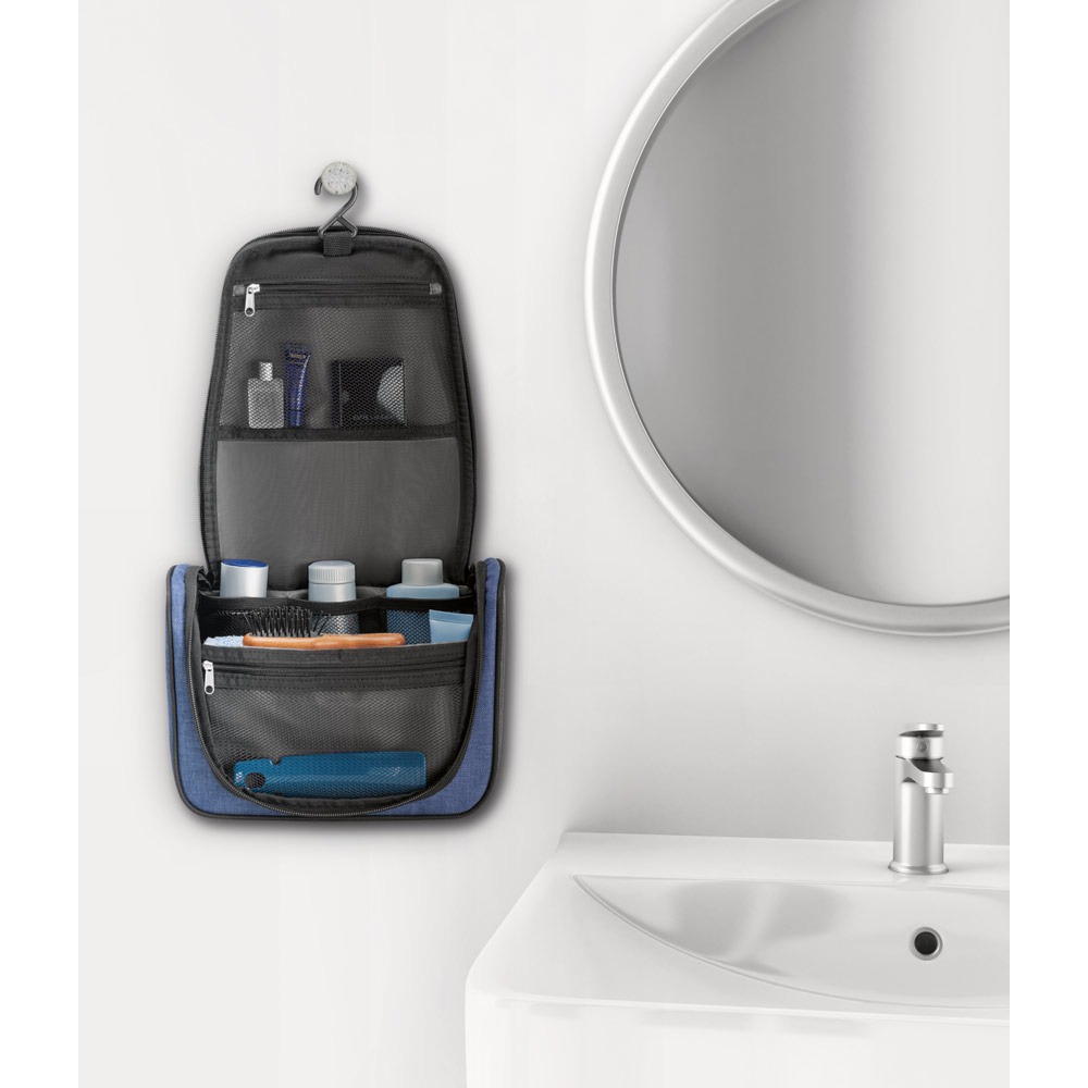 Bolsa de cosméticos em 600D de alta densidade. O compartimento principal tem zíper duplo e revestimento interior em 210D. Contém vários bolsos interiores e gancho no topo para pendurar.