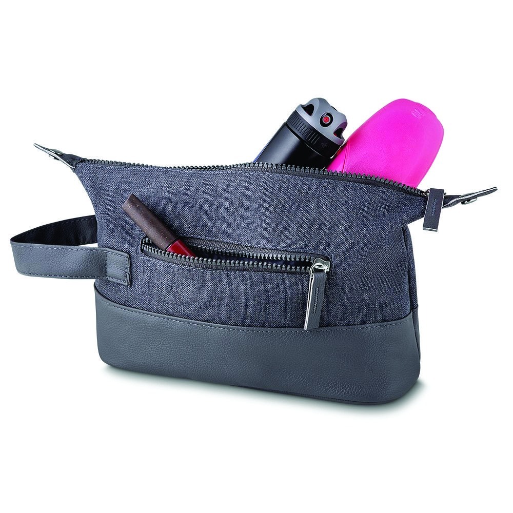 Necessarie com detalhes em couro sintético, tecido poliéster, alça de mão, bolso externo, botões laterais extensor, gravação Frontal.