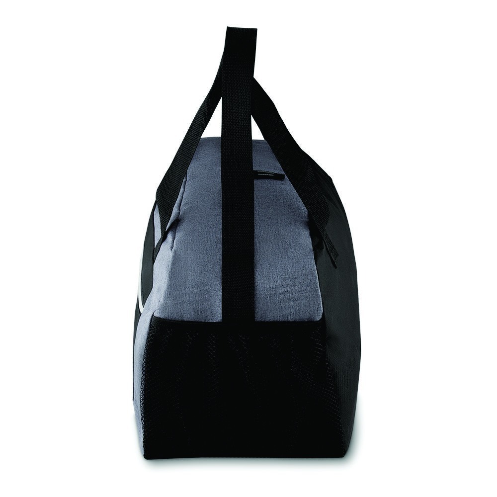 Bolsa esportiva em polyester, zíper frontal, bolsos laterais, alça de mão e ombro.