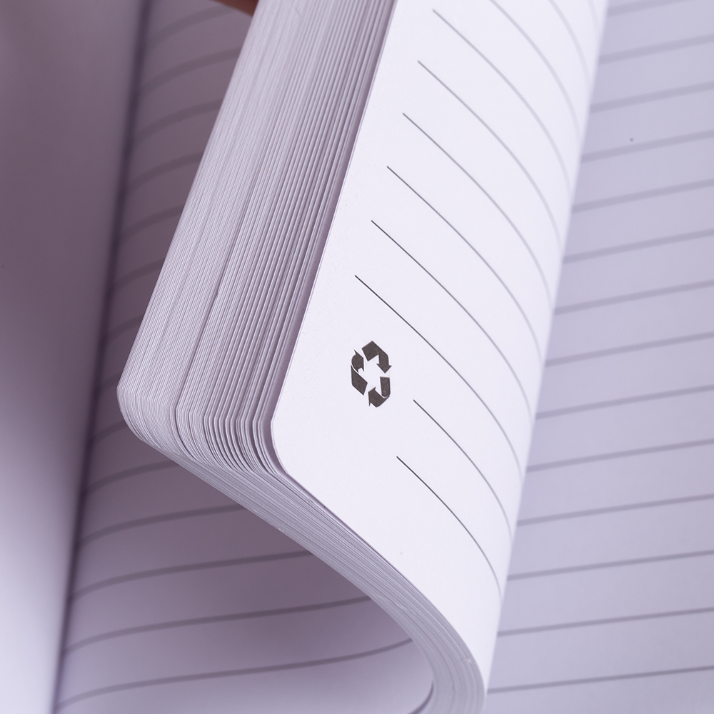 Caderno de anotações em couro reciclado com porta canetas, miolo com 80 folhas pautadas na cor branca. Obs.: Não acompanha a caneta.