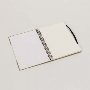 Caderno de anotações 21cm x 14cm, capa em papel kraft com elástico, contendo: