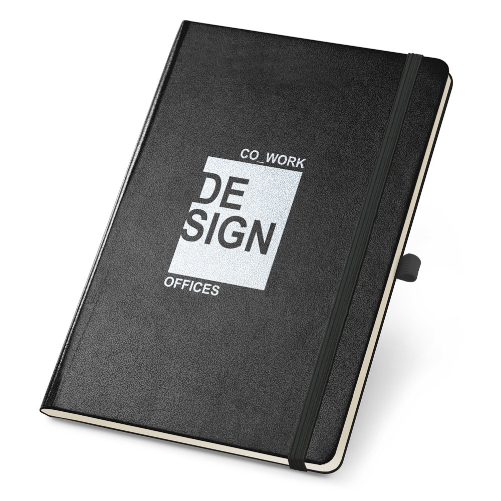 Caderno B6 com capa dura. Contém suporte para esferográfica, bolso interior e 80 folhas não pautadas em cor marfim.