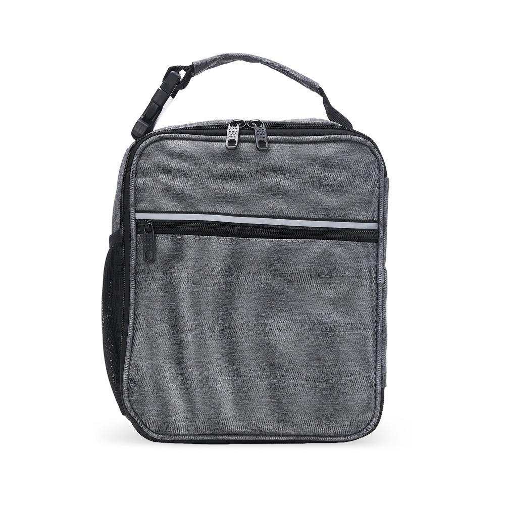 Bolsa térmica de nylon com dois compartimentos, capacidade de 6 litros. Com bolso telado e tela média de proteção interna, a bolsa possui uma faixa frontal refletiva, bolso lateral telado e alça de mão com fivela de encaixe.