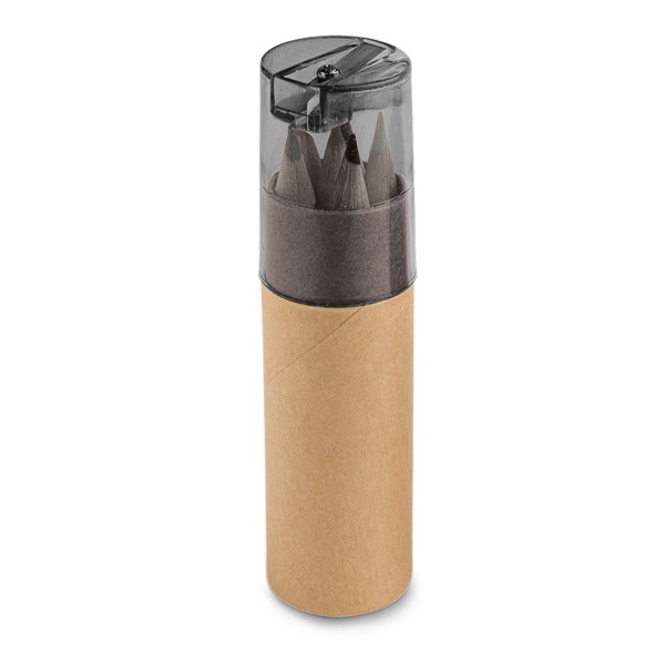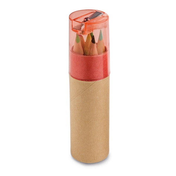 Caixa de cartão com 6 mini lápis de cor. Cartão e plástico. Com apontador.