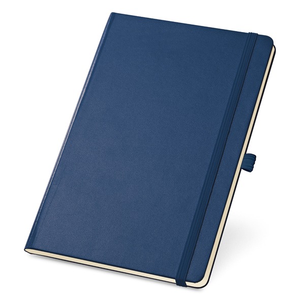 Caderno capa dura. Com porta esferográfica, bolso interior e 80 folhas não pautadas cor marfim.