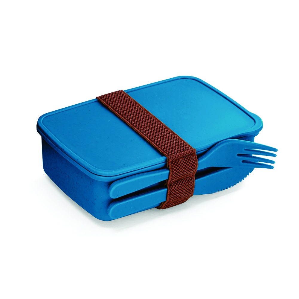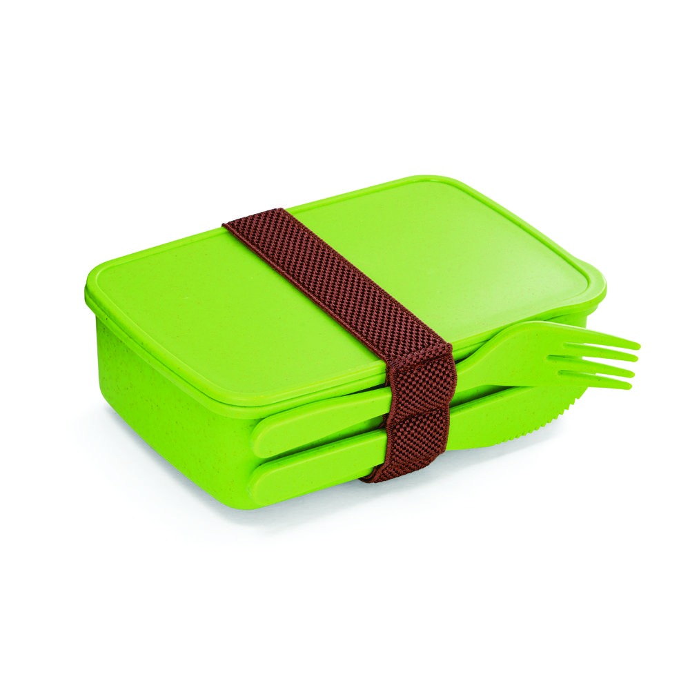 Marmita. Fibra de bambu e PP. Com 2 talheres: garfo e faca. Fecha com banda elástica. Apto para microondas (retirar a tampa). Food grade.