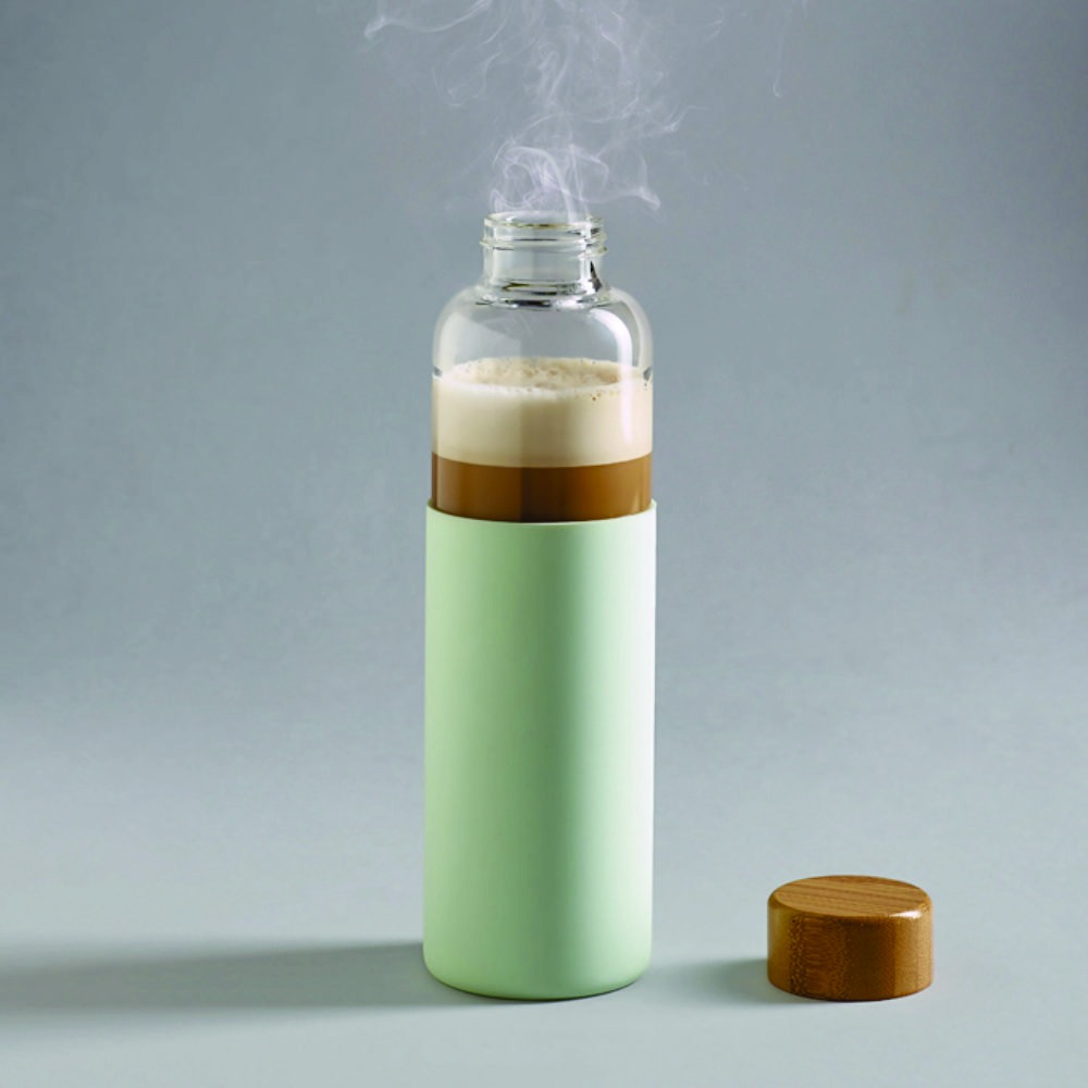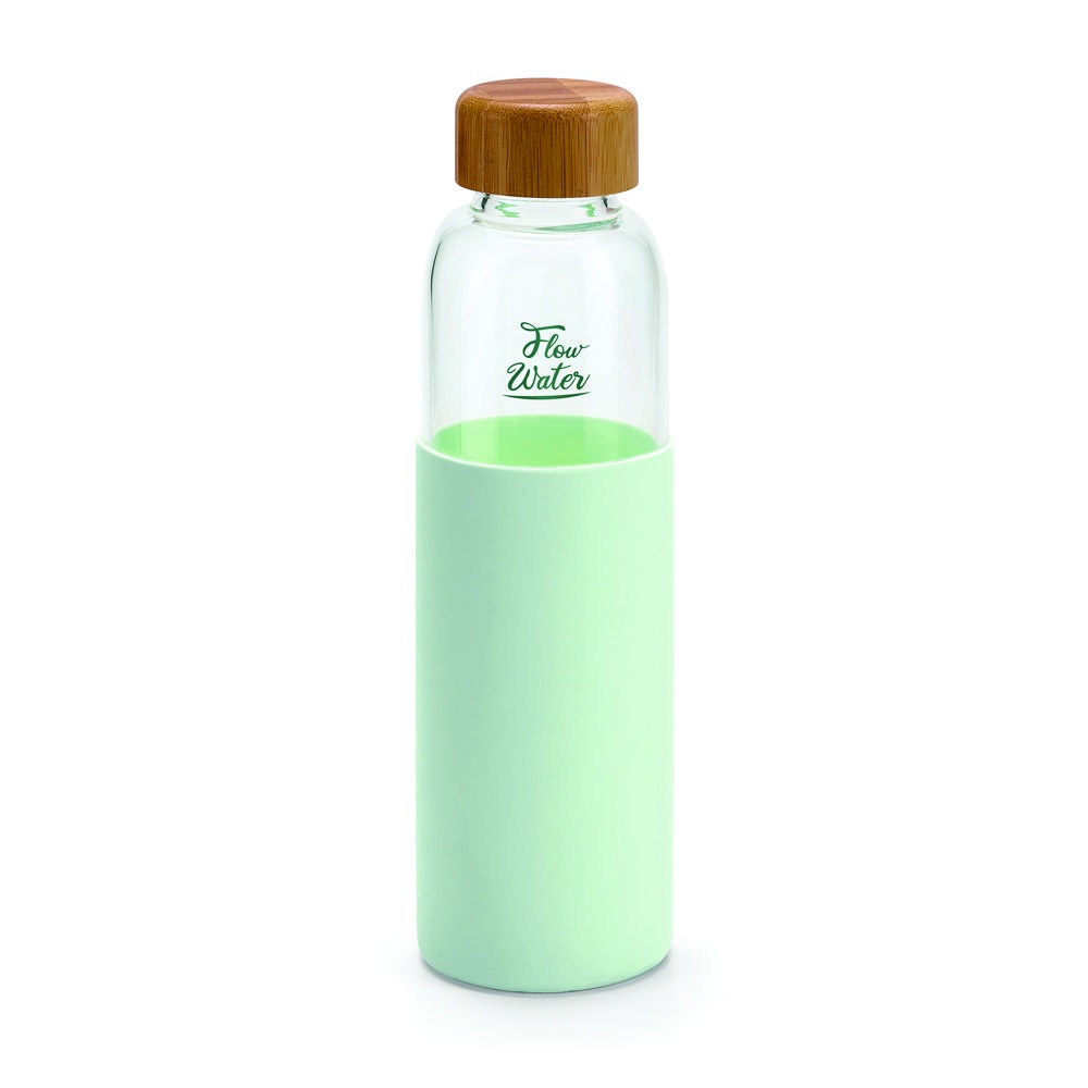 Squeeze. Vidro borossilicato. Com tampa em bambu e revestida com luva em silicone. Capacidade: 600 ml. Food grade. Fornecida em caixa.