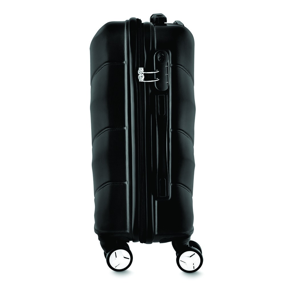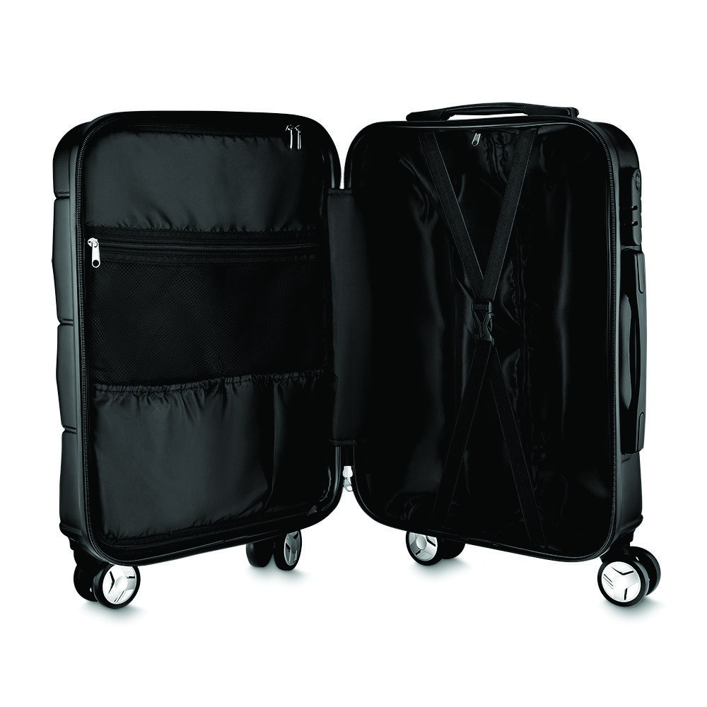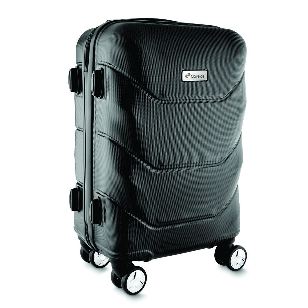 Mala viagem média ABS (Estireno de acrilonitrilo e butadieno), forro poliester, sistema de carrinho de aço, alça de mão, quatro rodas de 360 graus. Placa de metal para identificação (pode ser gravada a laser).