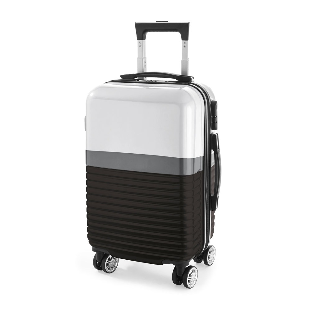 Mala de viagem executivo em ABS e PC com interior forrado, com divisória. Fecho de segurança com senha na lateral, 4 rodas duplas giratórias e pega extensível em alumínio, com mola (altura pega estendida até 510 mm). A mala tem capacidade até 33 L e peso de 2,70 kg.