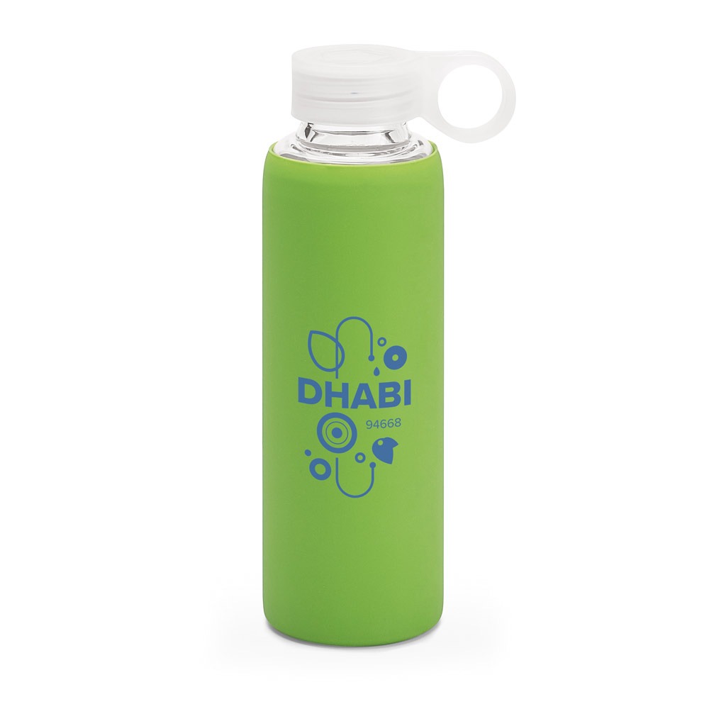 Garrafa em vidro borossilicato com tampa em PP e bolsa em silicone. Capacidade até 380 ml. Food grade. Fornecida em caixa.
