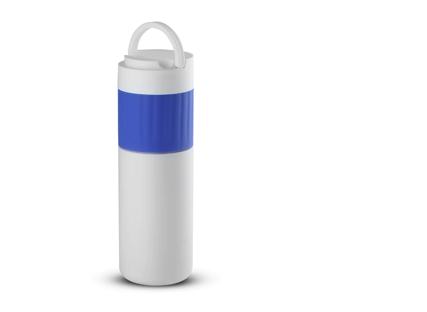 Garrafa térmica em aço inox com parede dupla isolada a vácuo, com capacidade de até 500ml. Conserva a temperatura quente ou fria, com alça e suporte para celular na tampa. Apoio para mão emborrachado e tampa rosqueável com anel de silicone para vedação.