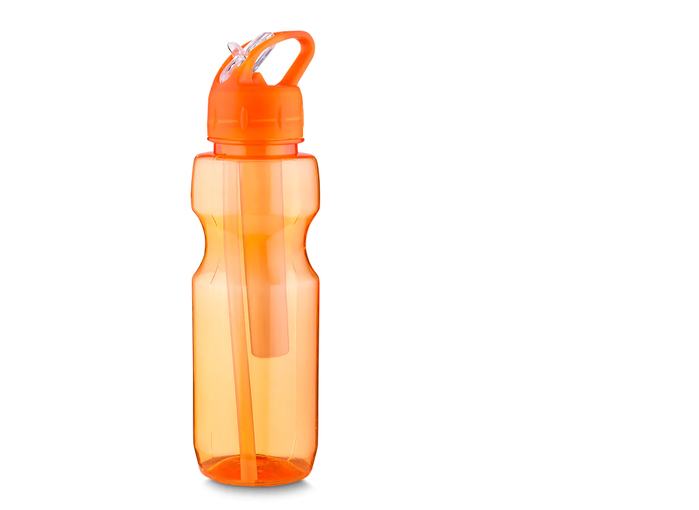 Garrafa plástica 700 ml com porta gelo e canudo, plástico utilizado AS (estireno de acrilonitrilo).