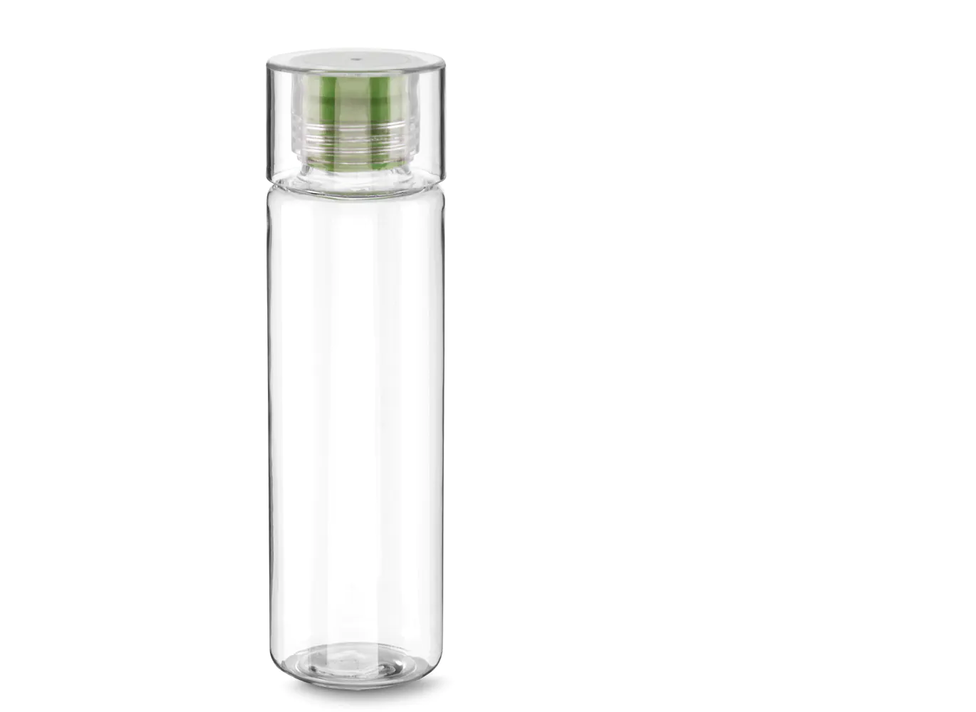 Garrafa plástica com capacidade de até 600 ml com borracha de silicone em cores. Tampa rosqueável. Plástico utilizado AS (Estireno de acrilonitrilo).