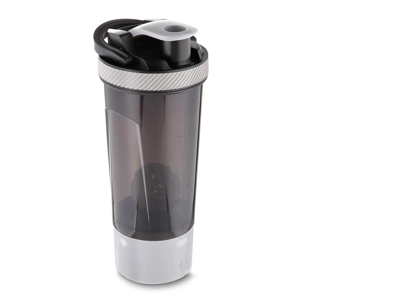 Garrafa coqueteleira plástica com capacidade de até 720ml. Com copo, misturador e peneira, ela se torna ideal para os treinos e exercicíos na academia, leve de transportar e funcional para o seu dia. Tampa rosqueável e anel de silicone para vedação, plástico Utilizado PP (polipropileno).