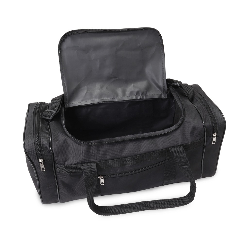 Bolsa de nylon 23 litros com quatro compartimentos, possui alça transversal regulável e alças de mãos.