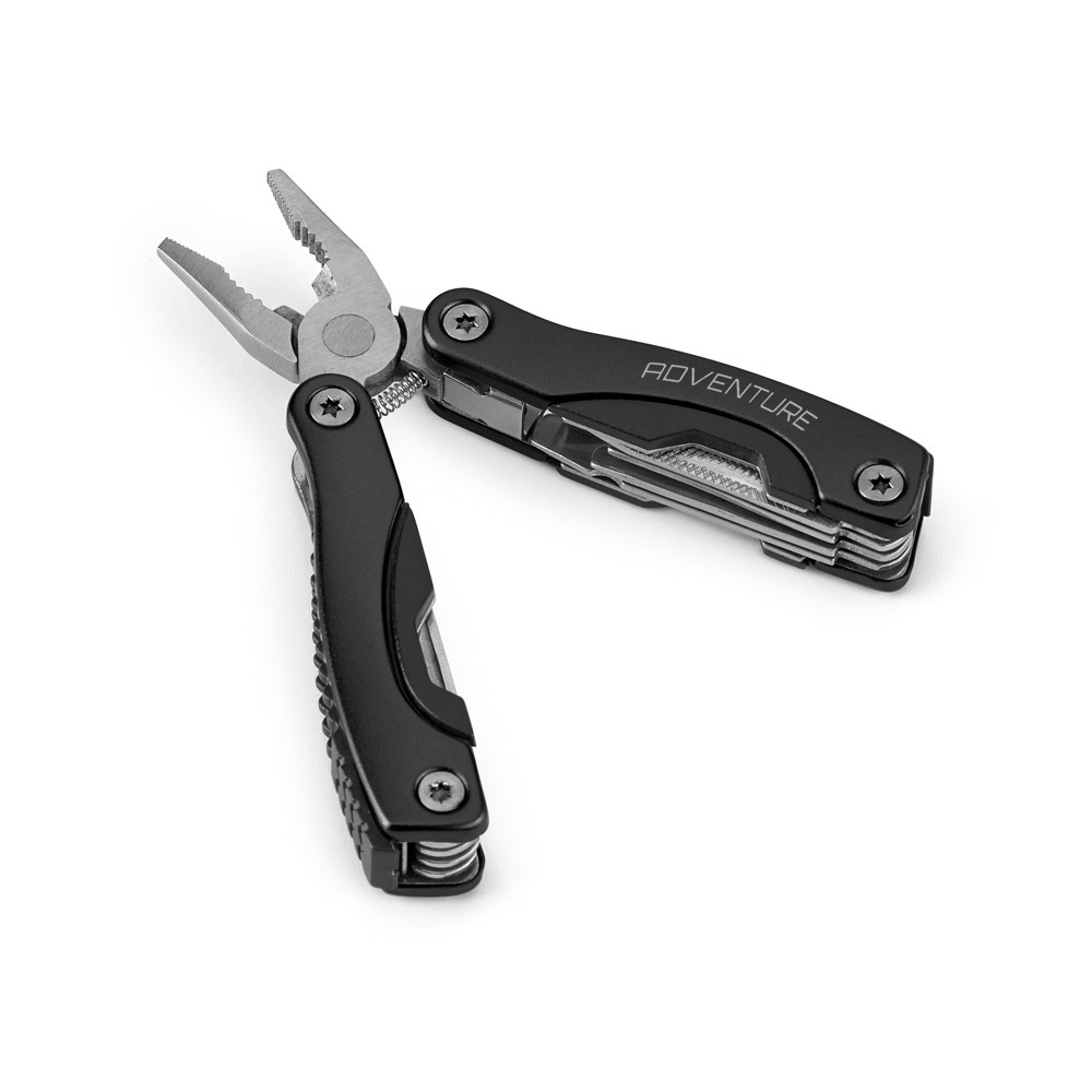 Mini alicate multifunções dobrável em aço inox e alumínio. Inclui 9 funções: alicate, lâmina de serra, 2 abridores, parafuso com a cabeça cruzada, faca, chave de fendas de cabeça plana (grande e pequena) e lima de unhas. Fornecido em bolsa de 600D.