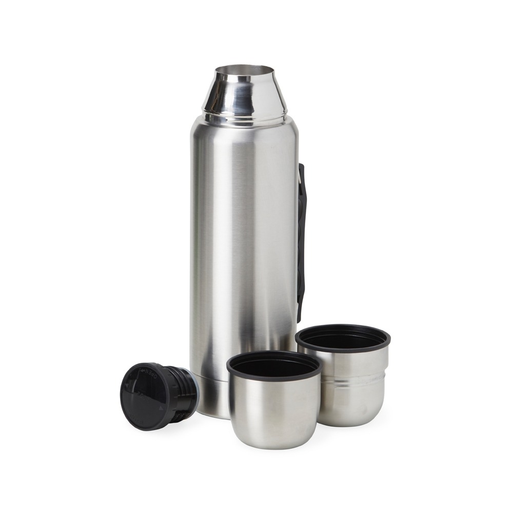 Garrafa térmica de inox com parede dupla e tampa dupla, capacidade de 1 litro. Com alça plástica para transporte, a garrafa contém duas tampas utilizáveis como copos.