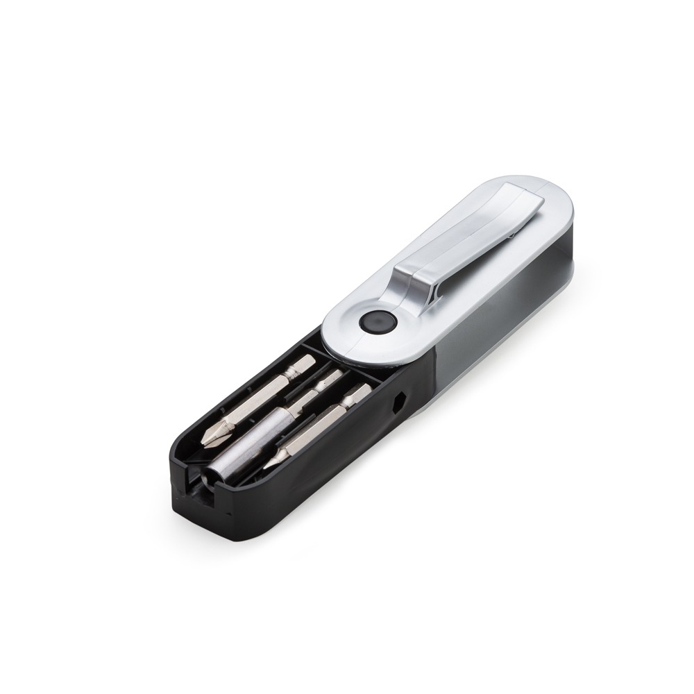 Kit ferramenta 9 peças de plástico resistente. Corpo prateado e verso com clip, há dois suportes para encaixar chaves na parte plástica preta. Para abrir o kit basta rotacionar o compartimento preto, acompanha 4 pontas de chaves Philips, 2 pontas de chave fenda, adaptador chave fenda, ferramenta auxiliar e adaptador chave Philips.