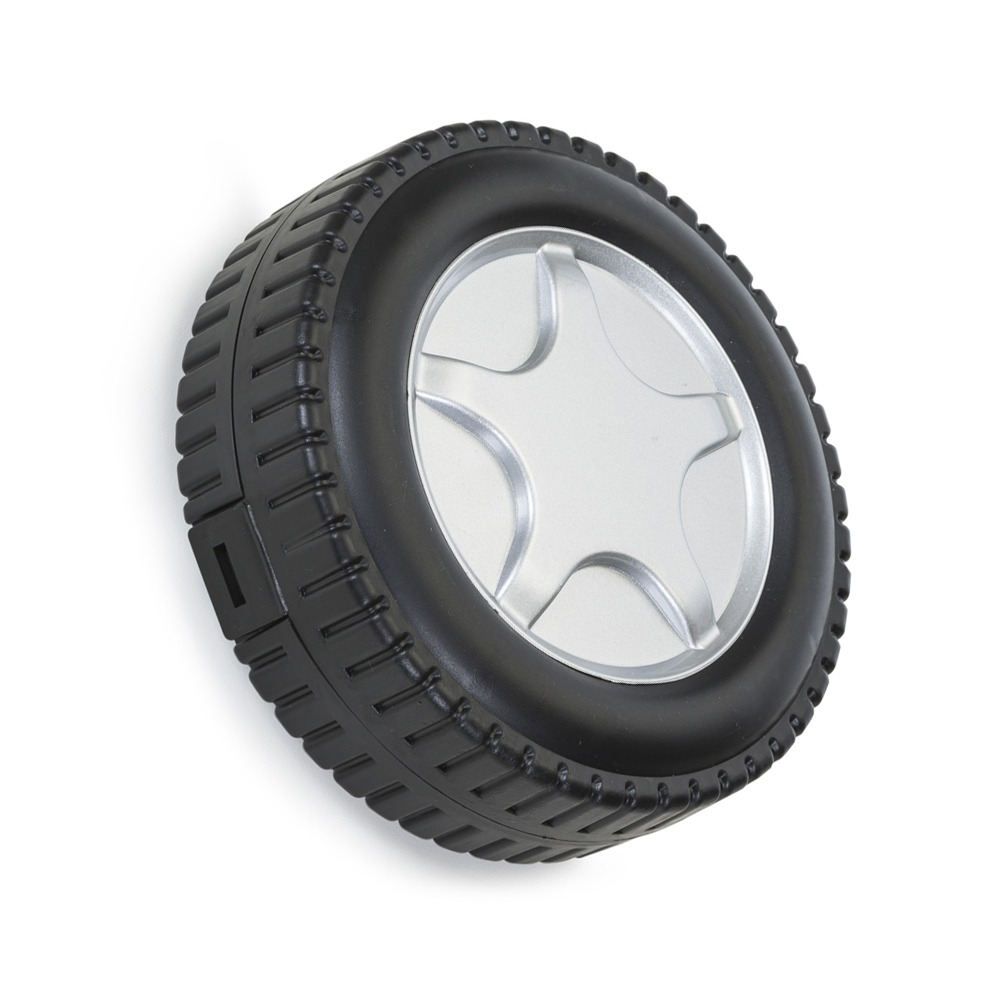 Kit ferramenta 20 peças com estojo formato pneu em plástico resistente. Pneu preto com aro prata, possui trava lateral. Contém: 2 mini chaves de fenda e 2 mini chaves phillips, estilete, 4 extensores bocais(7MM, 8MM, 9MM e 10MM), chave canhão e conjunto 10 pontas(4 chaves phillips, 2 chaves fenda, 3 chaves torx e um adaptador).