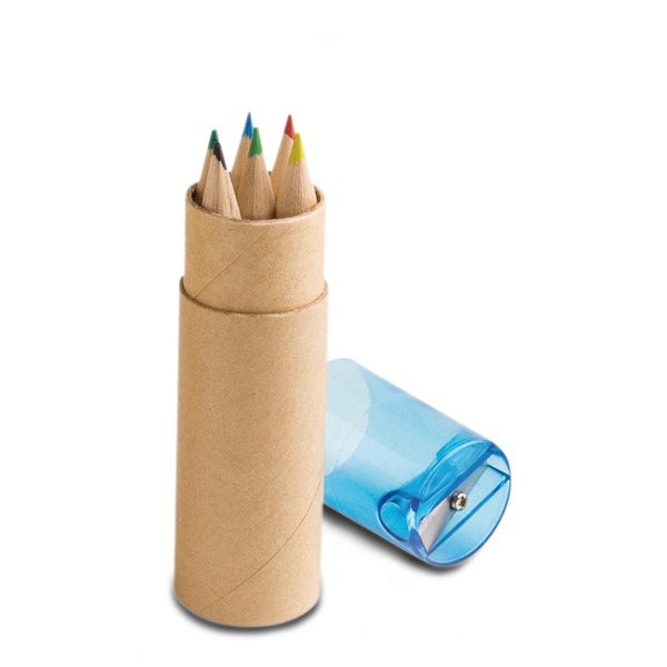 Caixa de cartão com 6 mini lápis de cor. Cartão e plástico. Com apontador.